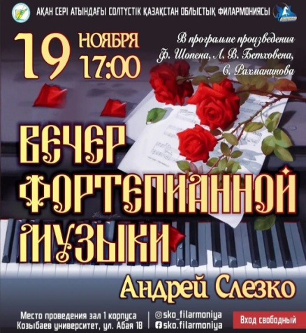 19 ноября педагоги и учащиеся школы посетили концерт фортепианной музыки. Чарующая музыка рояля, звучала в исполнении Андрея Слезко, солиста Северо-Казахстанской филармонии. В программе прозвучали произведения великих композиторов: Л.В. Бетховена, Ф. Шопена, С. Рахманинова.