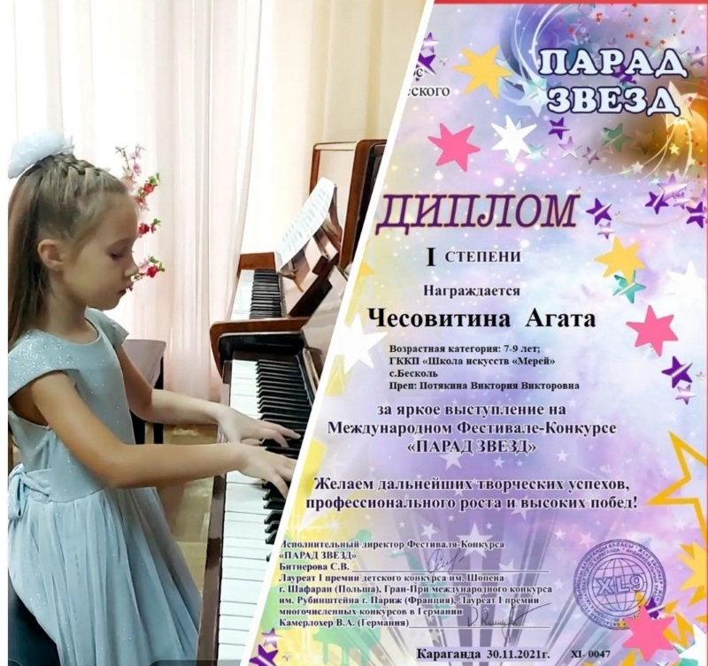 Клавиши фортепиано оживают под хрупкими пальцами Чесовитиной Агаты, первые шаги в музыке и первое выступление на международном конкурсе-фестивале «Парад звезд» г. Караганда. Она ученица 1 класса фортепиано (педагог Потякина В. В.). За свое яркое выступление была награждена Дипломом 1 степени. Поздравляем, Агата, это твой первый диплом в творческой копилочке!